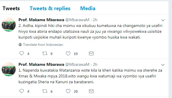 “Napenda kuwatakia Watanzania wote kila la kheri katika msimu wa sherehe za Xmas & mwaka mpya 2018,wito wangu kwa watumiaji wa vyombo vya usafiri ni kuzingatia sheria na kanuni za barabarani, kwani kipindi hiki cha msimu wa sikukuu kumekuwa na changamoto ya usafiri, hivyo kwa abiria endapo utatozwa nauli za juu ya viwango vilivyowekwa usisite kuripoti kwenye vyombo husika kwa wakati”, ameandika Profesa Mbarawa.